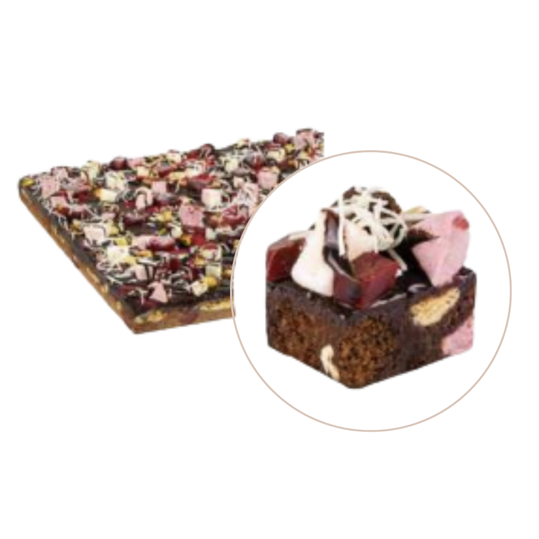 Rocky road in the form of a cake. Rich dark and white chocolate brownie base, peanuts, rich chocolate ganache topped with raspberry jelly, rose marshmallow and shredded coconut.